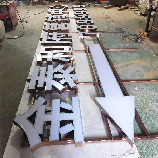 正面為不銹鋼圍邊,面板為亞克力(透光板),字殼內(nèi)安裝LED模組,背板為鋁塑板或PVC板。白天呈現(xiàn)不銹鋼金屬質(zhì)感,夜晚均勻發(fā)光,標識清晰,性價比高,應(yīng)用最廣泛。常用304不銹鋼,戶外或沿海地區(qū)建議使用316防銹性能更好的型號。厚度常見為0.8mm-1.2mm。